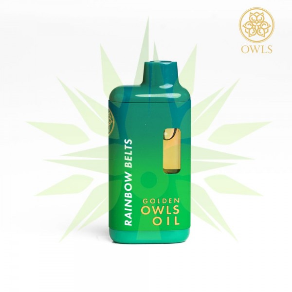 Taste the candy-inspired spectrum of Rainbow Belts in a sleek Golden Owls THCA disposable. This pocket-friendly pen pairs quality THCA distillate with strain-style terpenes for a bright, flavour-forward profile—sweet mixed fruit, tangy citrus, and a lightly sour candy finish. Pre-filled and easy to use, it delivers consistent flavour with zero maintenance.